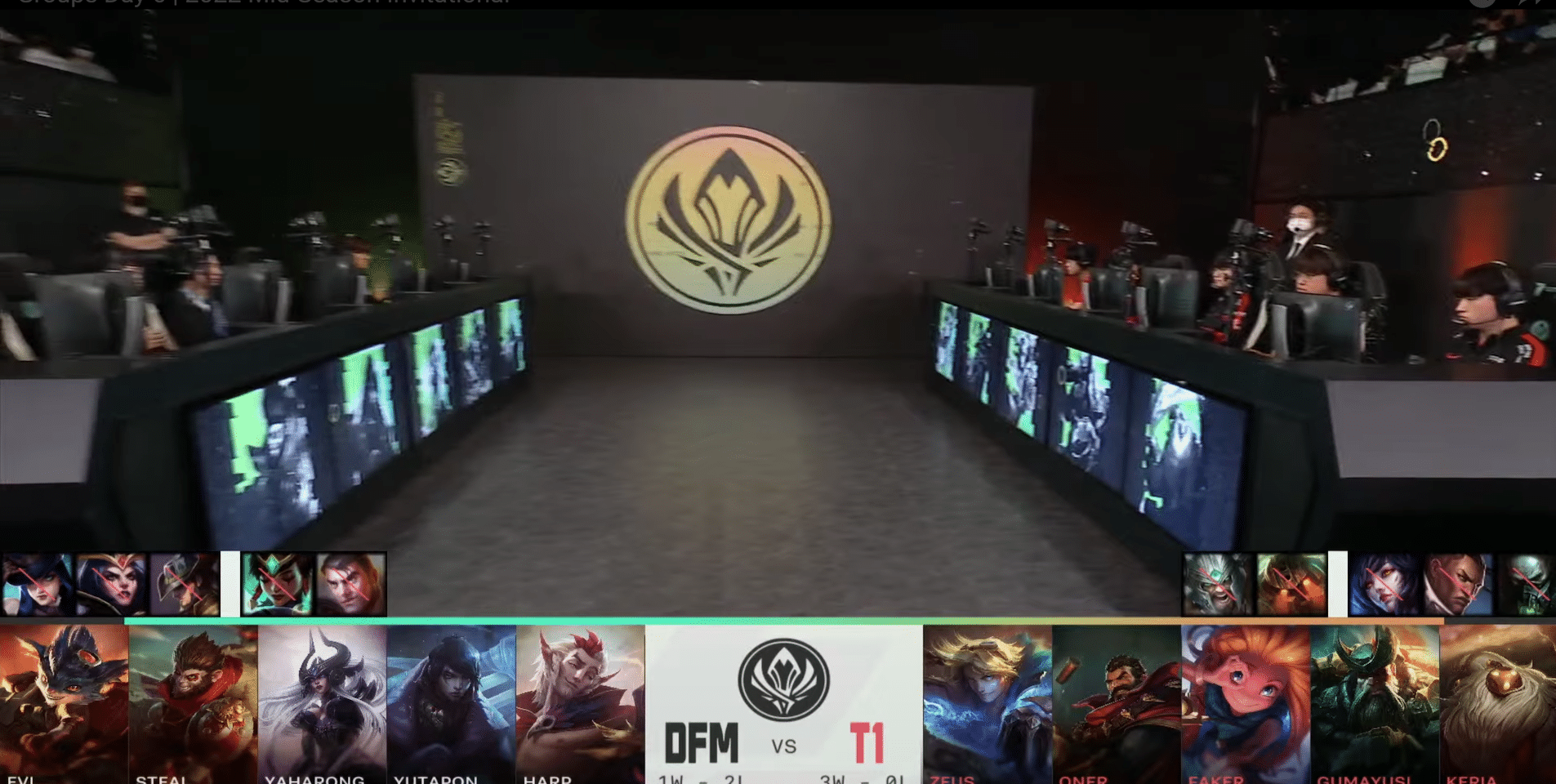 With South Korean T1 and Japanese DFM both drafting for the late game, the team gave each other space at the start game. First Blood went to DFM’s Evi at 4 and a half minutes, with DFM Harp showing up to secure the kill on T1 Zeus. On T1, Oner’s Graves and Keria’s Bard spent a good portion of the early game mid, securing plates and towers for their star playmaker Faker and keeping DFM Yaharong’s Syndra on the backstep. The game remained relatively close, with T1 ahead at 15 minutes with a 2.3k gold advantage. T1 focused on objectives before moving to Baron where DFM forced a desperate fight, resulting in a 4-man wipe and a free Baron for T1, along with a 7.5k gold lead at the 21-minute mark.