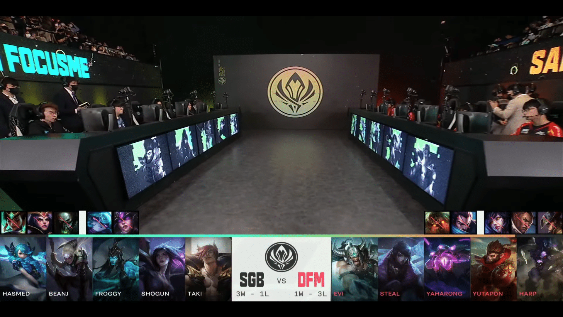 Shogun, handing SGB a 3k lead. At 18 minutes a fight around Baron saw Shogun deleted by Evi, while Steal took on Taki and Beanj solo before turning on Hasmed for the triple kill and Ace. DFM found a pickoff on Beanj mid-lane and moved towards the Baron. The remainder of SGB followed but lost another 3 players in the face of Steal’s monstrous Wukong. DFM took Baron at 22 minutes. After a rough start with harassment from rotations mid, Yaharong’s Velkoz finally came online. By 25 minutes DFM had pulled ahead with a 2k gold lead. They had trouble closing out the game, however, and at 32:30 some fancy footwork from Beanj lead into an Ace for SGB, scoring them an inhibitor. Around 36 minutes DFM found themselves flanked, with Taki and Beanj forming the frontline that Hasmet and Shogun needed to take DFM off the map in a second Ace.