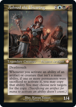 The backup Commander is a character whose debut has been long awaited: it’s Ashnod the Uncaring! She also costs 2UBR, and is a 1/4 with Deathtouch. She also doubles your artifacts’ non-mana abilities on the condition that you can only double abilities that are activated by sacrificing one or more permanents. You can also choose new targets for the copy. She also has a rules text at the end of her ability which states that sacrificing an artifact for mana to activate an ability doesn’t count, to eliminate the problem of Treasures – but if you have to sacrifice an artifacts to activate an ability, you can most definitely use a treasure for that.