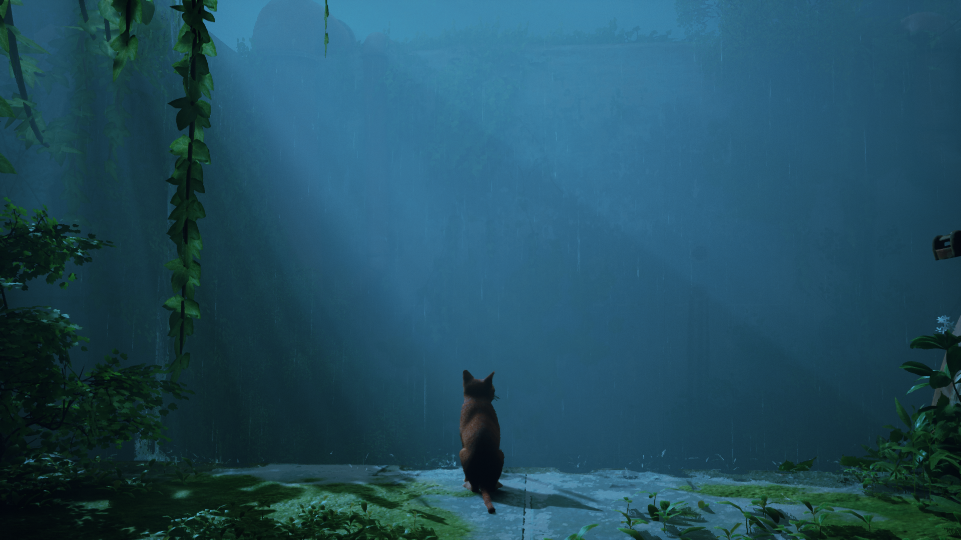 Oh. Do you want to hear more about the cat game? Well fine. Let’s start with the premise then. You play as Stray, I assume that’s the name of the cat you’re playing. But you could also name it after your very own cat that is watching you play, confused about what is going on. Anyways, after a short exploratory session with a few fellow cats, you get split from your furred friends and fall deep into some kind of underground city.