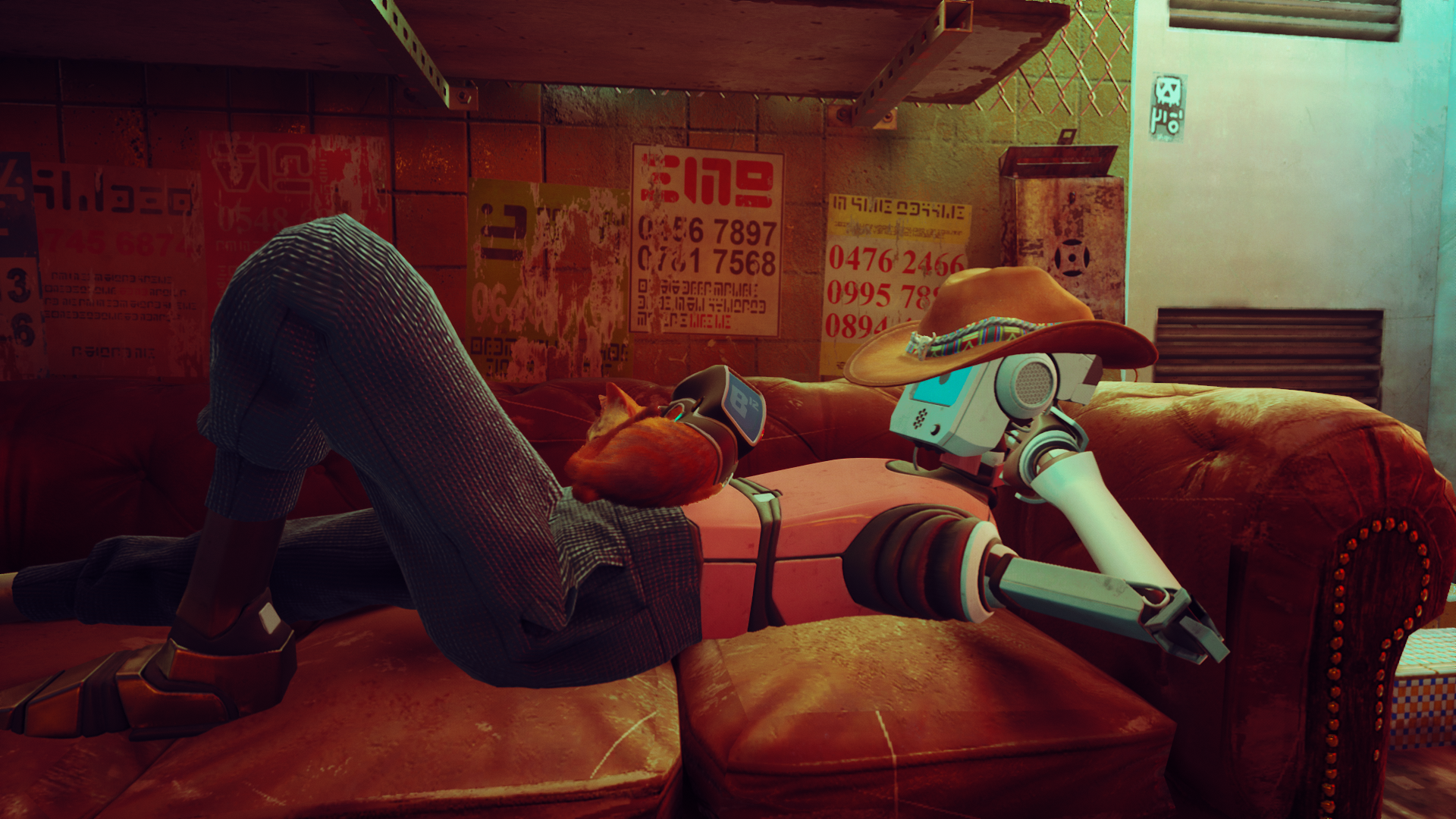 So yes, this reminded me of Deus Ex: Mankind Divided and its charming sections in futuristic Prague. By that, I mean mostly the small puzzle box aspect, so I guess we can pencil in Stray as some kind of immersive sim? Just instead of shooting and uncovering the tragedy of the human condition, your main goal is to find a cozy spot to nap.