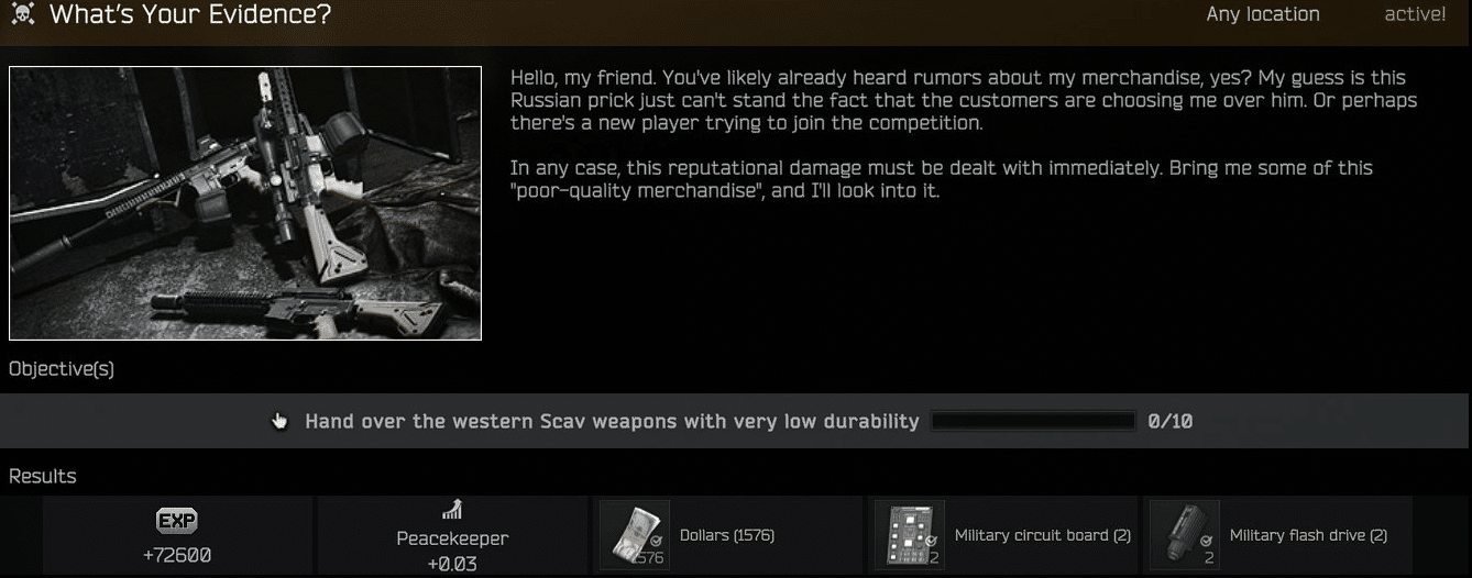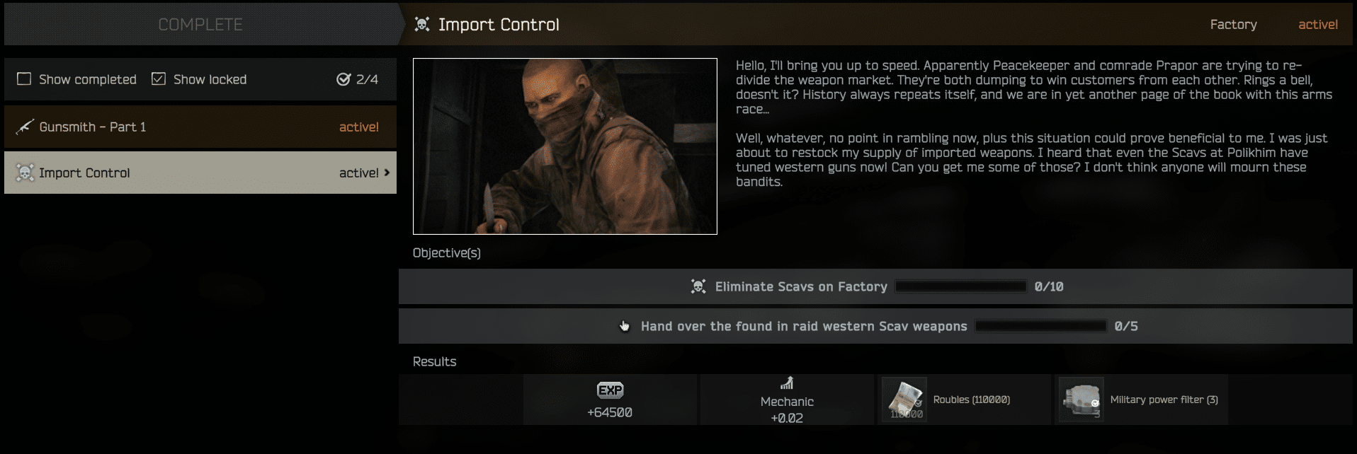 Import Control is the first quest in the chain, and will see Factory become a bloodbath (on PvP). The event is also likely a teaser for the new Factory update. While in the event, Scavs sometimes have Western Weapons, though, these are often on very low durability.