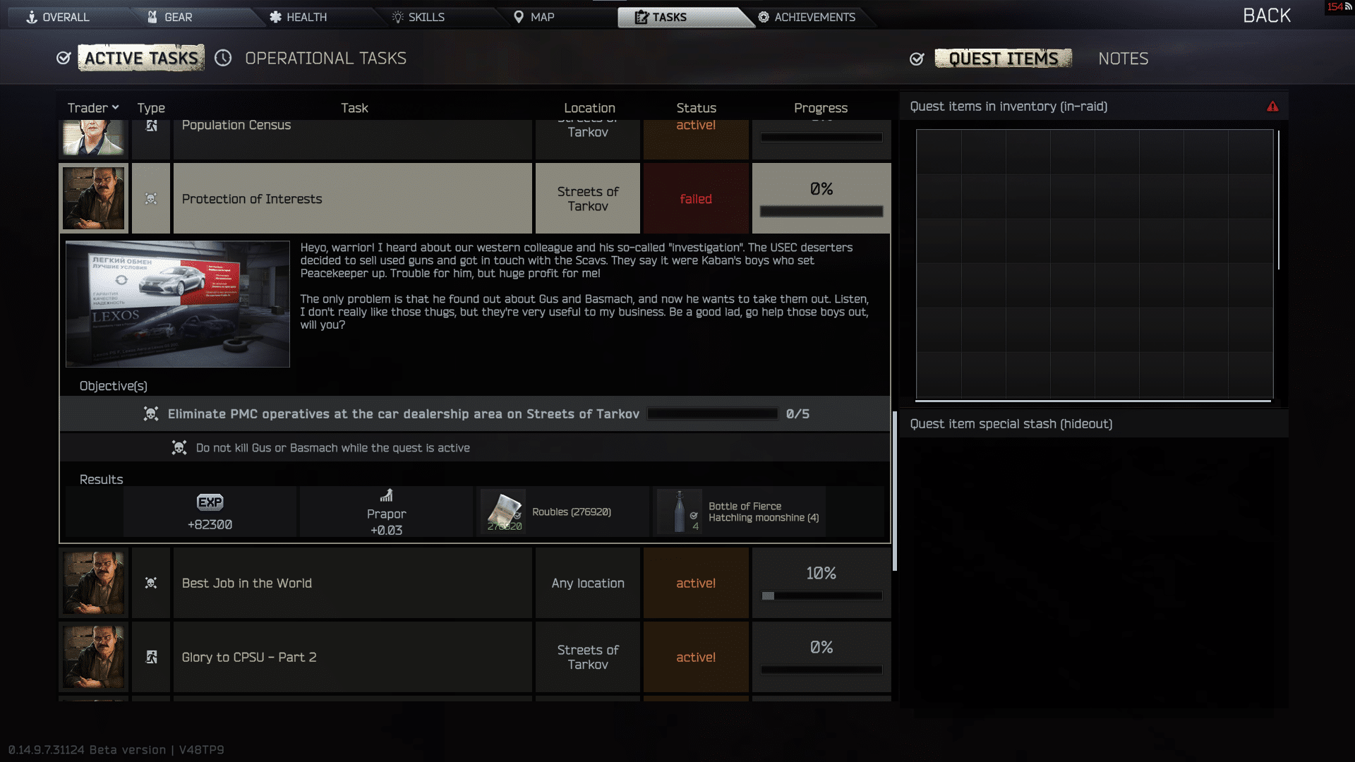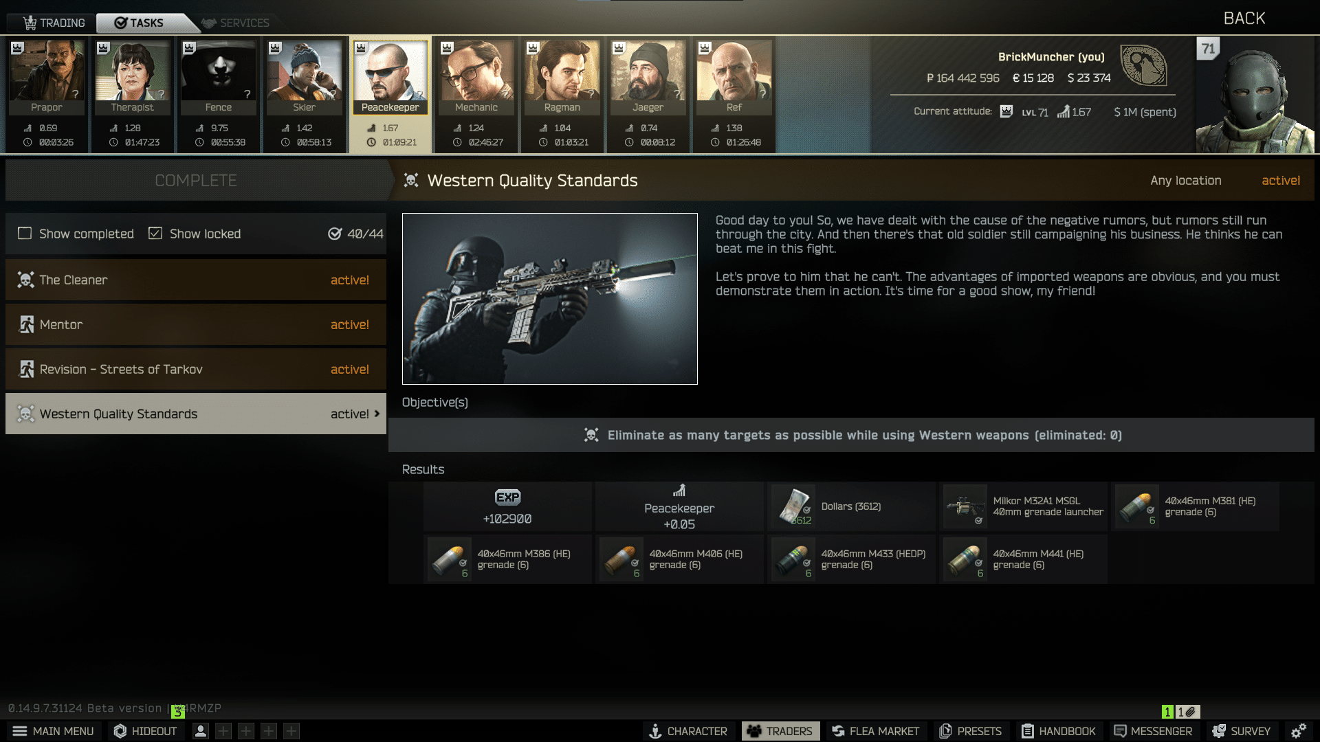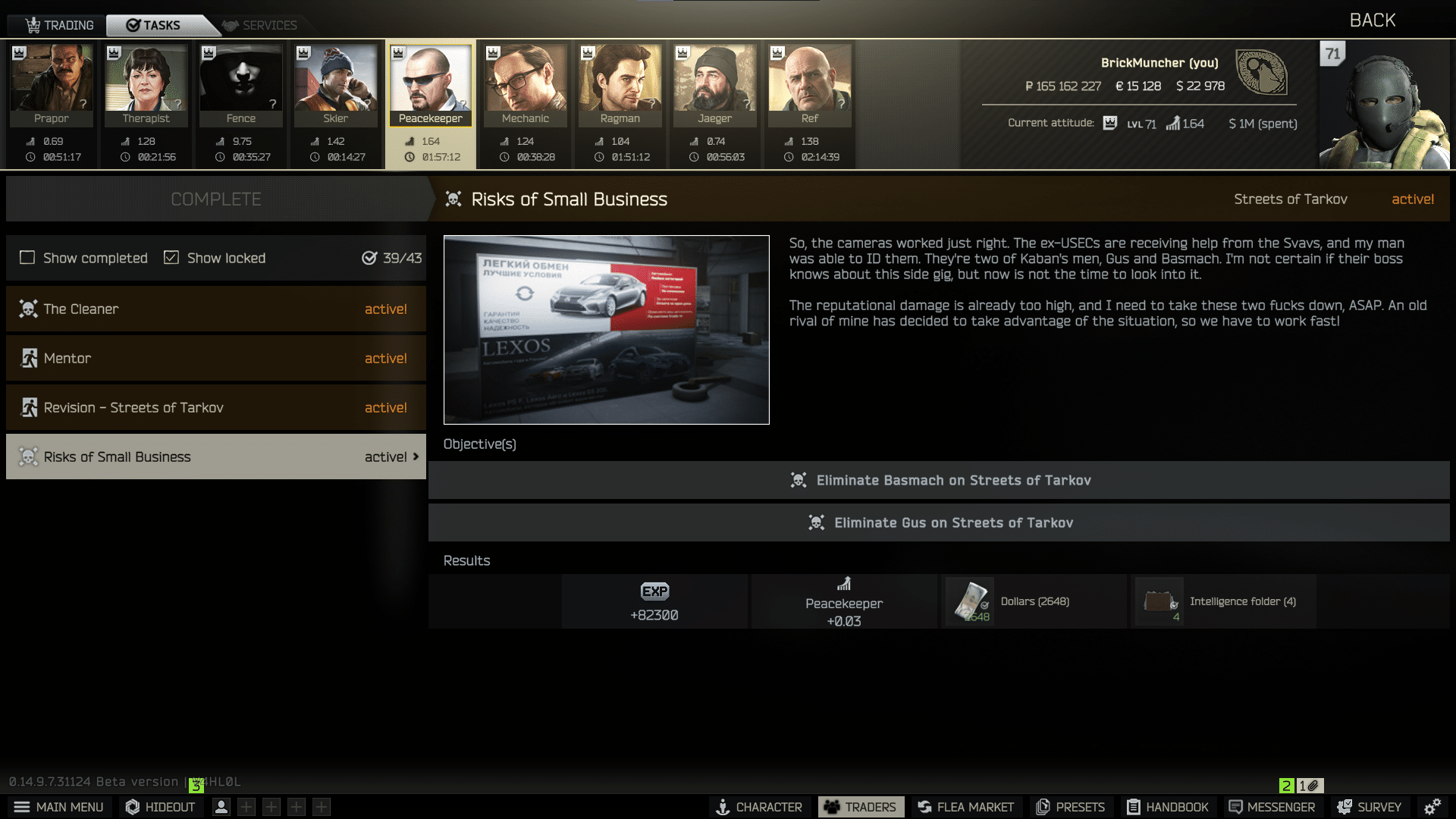 - Pick a side, Peacekeeper or Prapor and track progress on the websites for each trader (these are currently not working)
