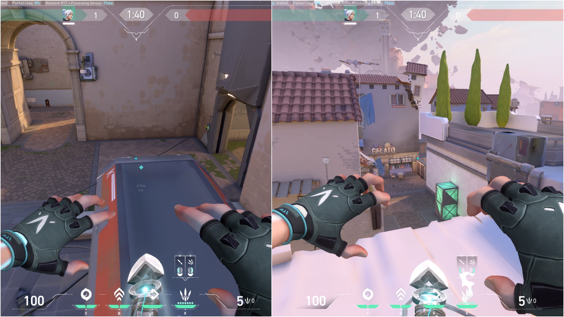 Another useful updraft spot for the defending side on Ascent is found at the A-tree location. To execute this one, position yourself on the depicted box in the provided image and updraft twice. The outcome is an enhanced line of sight, covering over fifty percent of the site area.