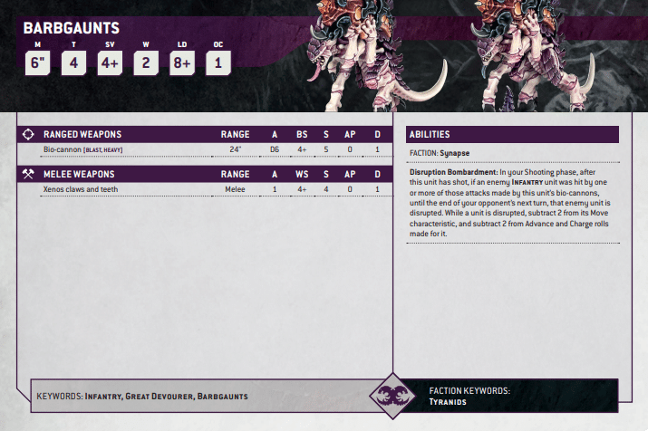 While there are some incredible models in this box, the Barbgaunts are one of the standouts for me, as they are a silent killer: while they don’t really wipe enemies off the battlefield with their 0 AP Damage 1 weapons, their Disruption Bombardment can make life hell for armies that want to get up close and personal, as it subtracts 2 from every type of movement they can make, let it be a simple Move, an Advance or a Charge. This makes them perfect to hold key objectives or protect key targets, where they can rain bio-hell down upon everyone brave enough to get close to them.