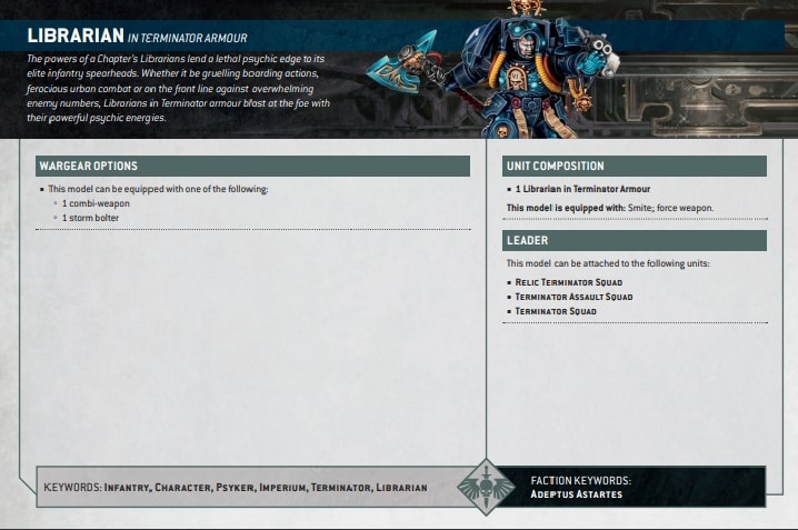 One of the flashiest models in the Leviathan Box (at least on the Adeptus Astartes’ side is the Librarian in Terminator Armour. This glowing paragon of psychic might can join the same squads as the Captain becoming their leader, which gives the unit a 4+ Feel No Pain against Psychic Attacks and the Sustained Hits 1 keyword. He can also ditch his storm bolter for a combi-weapon, which has less attack at range, but up close, it can be much more devastating than a humble bolter. His Smite has huge potential as well, capable of dealing 18 Wounds if you hit the god-roll.