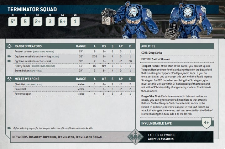Of course, I couldn’t look over the new Terminator models, which look absolutely stunaning, while also packing a punch on the battlefield as well. They have a few options for heavy weapons if their squads are big enough, being able to swap their bolters for flamers, assault cannons or missile launcers. They also have the Deep Strike keyword and the Teleport Homer ability, which let’s them surprise enemies by arriving in their Movement Phase even if you don’t have CP. They are also a deadly force in both melee and ranged thanks to their Fury of the First ability, which let’s them ignore any BS/WS modifiers, while also giving extra chances to Hit against their Oath of Moment target.