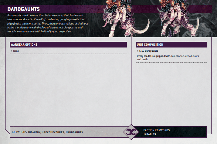 While there are some incredible models in this box, the Barbgaunts are one of the standouts for me, as they are a silent killer: while they don’t really wipe enemies off the battlefield with their 0 AP Damage 1 weapons, their Disruption Bombardment can make life hell for armies that want to get up close and personal, as it subtracts 2 from every type of movement they can make, let it be a simple Move, an Advance or a Charge. This makes them perfect to hold key objectives or protect key targets, where they can rain bio-hell down upon everyone brave enough to get close to them.