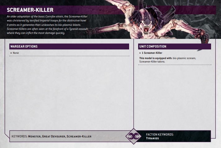 One of the most awaited model of 10th Edition, the reimagined Screamer-Killer looks incredibly scary, and it’s bite seems to be worse than it’s bark. This giant monster has 10 Attacks in melee hitting on a 3+ normally, with a Strength characteristic of 10, -2 AP and 3 Damage – so God-Emperor help anyone, even the toughest warriors who get in range of this specialized Carnifex. While the Shadow in the Warp can force Battle-shock tests, the Screamer-Killer can wreak havoc on it’s own thanks to it’s Death Scream ability, and with it’s Assault Bio-plasmic scream, it won’t be hard to trigger it’s skill.