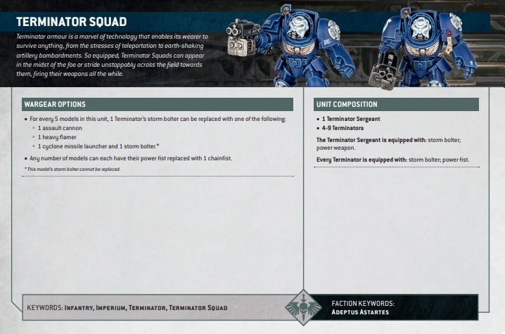 Of course, I couldn’t look over the new Terminator models, which look absolutely stunaning, while also packing a punch on the battlefield as well. They have a few options for heavy weapons if their squads are big enough, being able to swap their bolters for flamers, assault cannons or missile launcers. They also have the Deep Strike keyword and the Teleport Homer ability, which let’s them surprise enemies by arriving in their Movement Phase even if you don’t have CP. They are also a deadly force in both melee and ranged thanks to their Fury of the First ability, which let’s them ignore any BS/WS modifiers, while also giving extra chances to Hit against their Oath of Moment target.