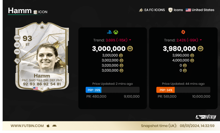 The Mia Hamm EA FC 24 Icons card has been hailed as one of the best Icon cards to ever grace Ultimate Team. The stats breakdown doesn’t do justice to the incredible in-game feel you get with this card. You can leave defenders bamboozled without breaking a sweat, effortlessly find the perfect angle, and smash one into the top corner with equal ease. The Power Shot PlayStyle+ makes her shots incredibly powerful. Her PlayStyle portfolio, which features Finesse Shot, Rapid, Quick Step, and First Touch, explains why she feels so smooth on the ball.