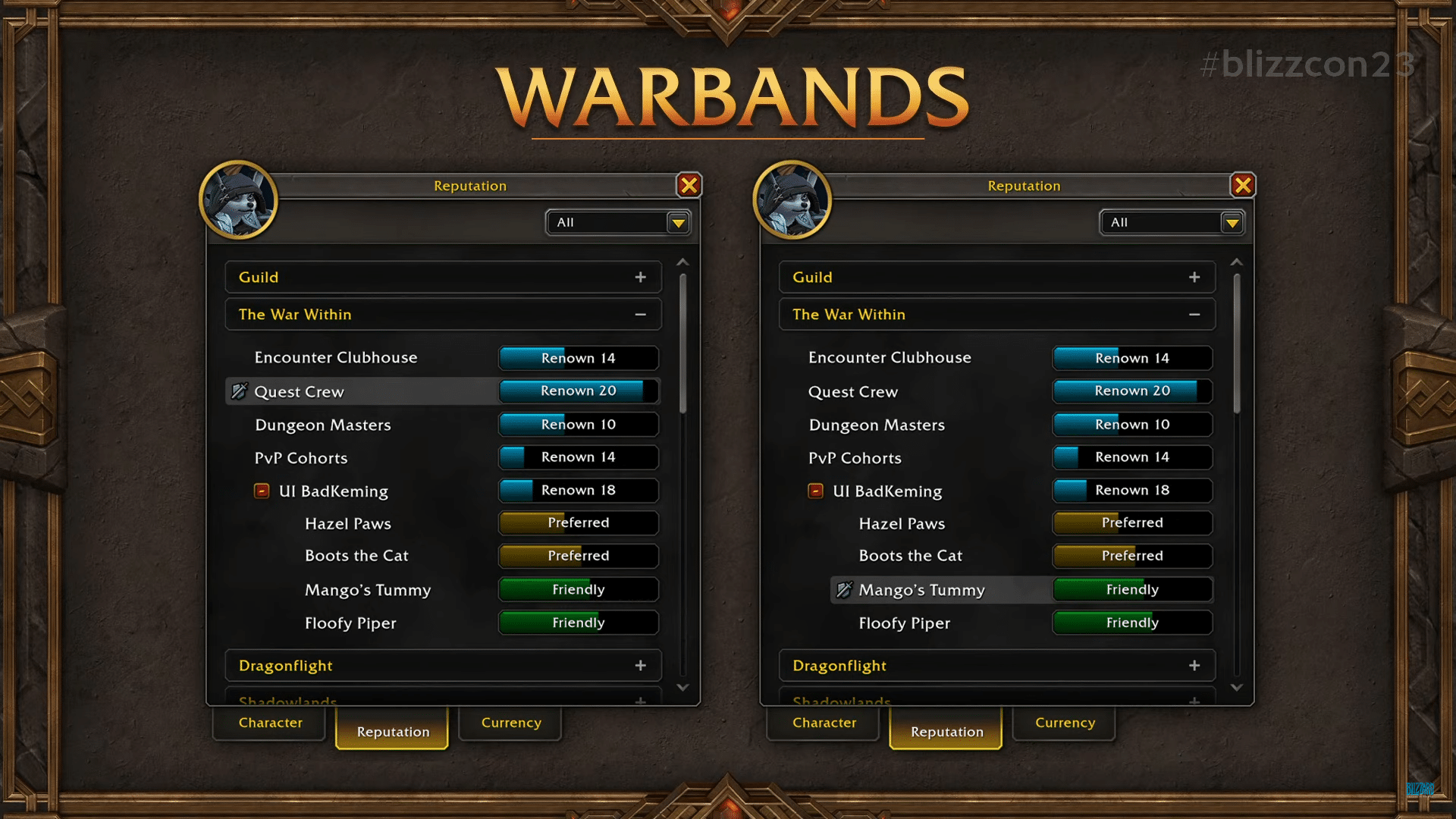 Share banks, transmogs etc with your alts as one “Warband”. With Warbands, players will get full account-wide progression with all characters in their account, regardless of faction. So that’s a Warband bank, achievements, and changes to the transmogs system to work with this new feature.