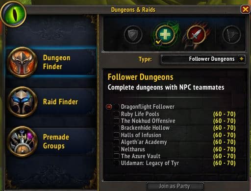 Follower Dungeons will allow players to enter a dungeon que where NPCs will fill the empty roles in the party. Players will be able to que solo for a Follower Dungeon, or in a group with friends. These NPCs can fill any roll, so you do not need to worry about getting a tank or healer. Currently this feature will only be available for the 8 original Dragonflight dungeons. But I can see this being expanded to other dungeons if players enjoy them.