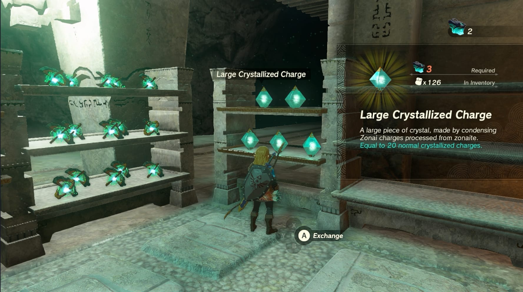 Alternatively, you can also exchange 3 Large Zonaite for a Large Crstallized Charge which is worth 20 Crystallized charges. These will also drop from the various mini-bosses down in the Depth which respawn after every Bloodmoon.
